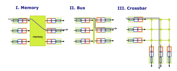- Some modern routers switch via memory, but the lookup and storing into the appropriate memory location is performed by processing on the input line card (which make them look like shared memory multiprocessors).